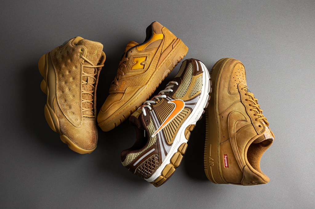 It goes without saying that wheat-colored sneakers are an essential part of fall footwear. From the Nike Air Force 1 “Wheat” to the New Balance 550 “Wheat,” and every other brand’s spin on the golden-hue, “Wheat” sneakers are always a go when it comes to dressing for fall. This season, we expect sneakers in other fall-inspired colors to also fly off shelves. This includes shoes like the Air Jordan 5 “Burgundy,” the New Balance 990v2 “Brown/Orange/Purple,” and the Air Jordan 1 High OG “Palomino.”